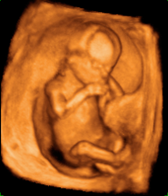 La ecografía 4D muestra al bebé moviéndose a sus anchas en el útero materno. Este plano de perfil muestra brazos, piernas y cordón umbilical en movimiento constante, lo que es es signo de vitalidad fetal. Las estructuras básicas de un feto de 12 semanas de gestación se parecen mucho a las de un bebé recién nacido; es ya todo un niño, aunque le falten unos seis meses aproximadamente para ver la luz.